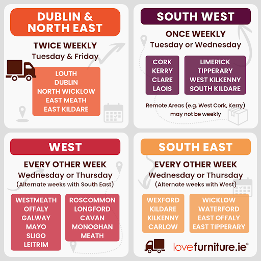 - The day of your delivery is influenced by your location. These are the areas we deliver to across Ireland by day: